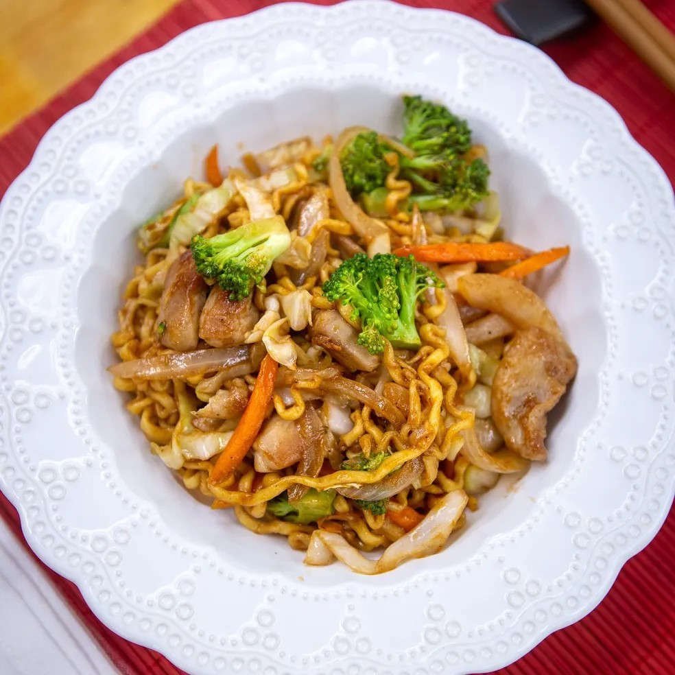 Macarrão, legumes, carne refogado ao molho (foto ilustrativa)