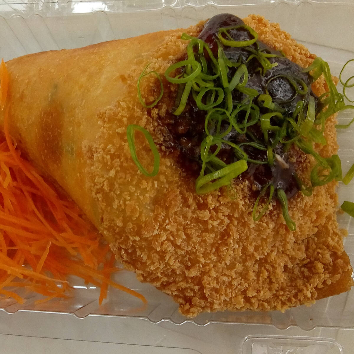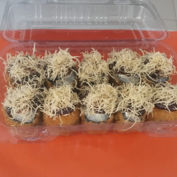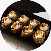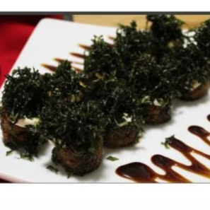 Enrolado de arroz com recheio de salmão e cream cheese, empanado e frito coberto com molho teriyaki, cream cheese 10 unidades