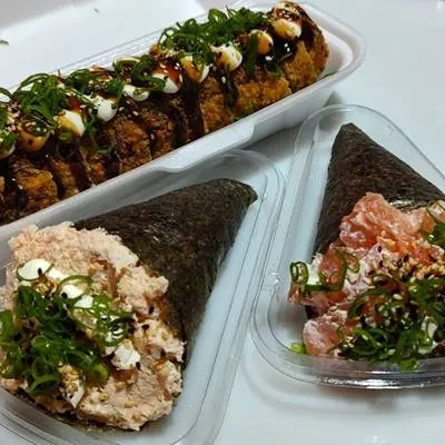Temaki Com Massa De Haromaki Frita, Recheado Com Salmão Grelhado E Creme Cheese. Acompanha: 1 hashi, 2 shoyo, 1 pote de teriaki, 1 guardanapo envelopado, 1 nozu para molho R$ 38,99