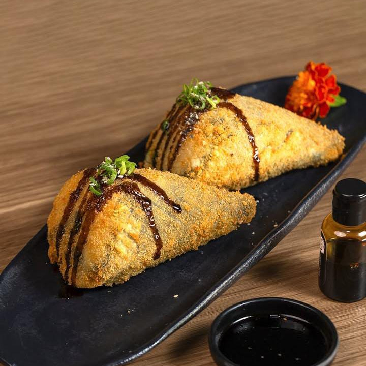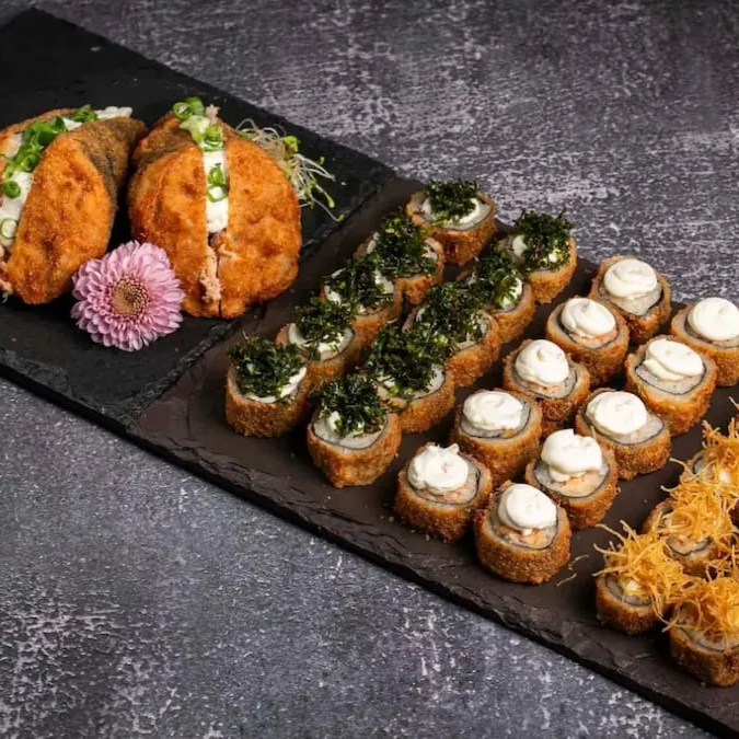 Leve 16 unds saboroso sushi com arroz, enrolado na massa empanada crocante, com recheio cream cheese E Kani