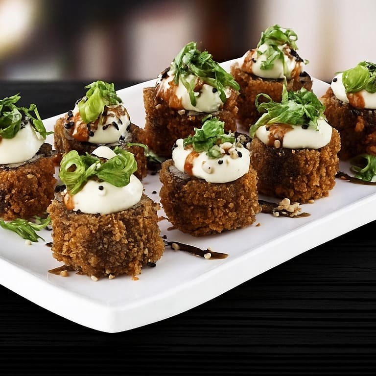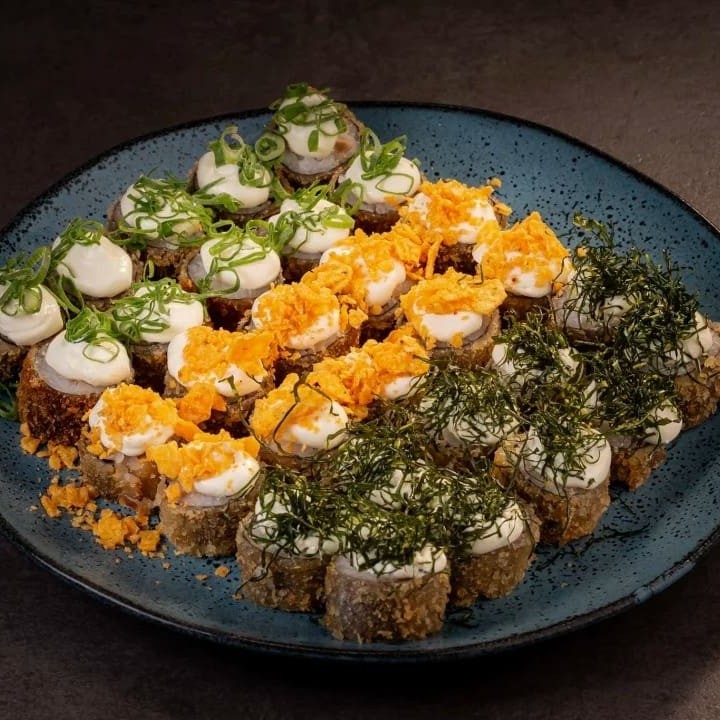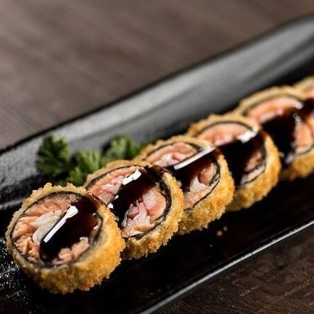 Leve 16 unds saboroso sushi com arroz, enrolado na massa empanada crocante, com recheio cream cheese E Kani