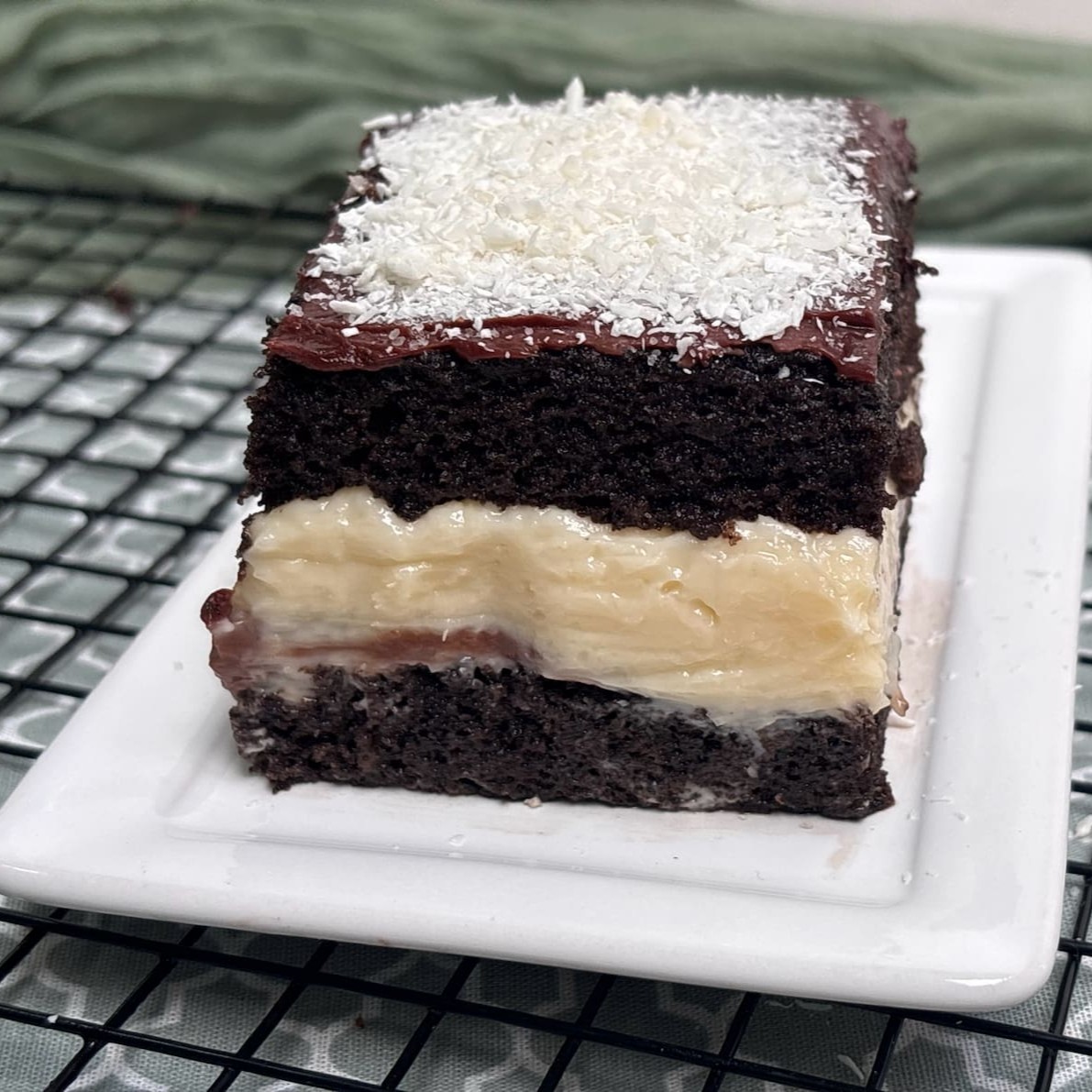 O nosso bolo gelado é feito com uma massa de cacau black bem molhadinha, recheio de brigadeiro de coco e ganache de chocolate ao leite.
