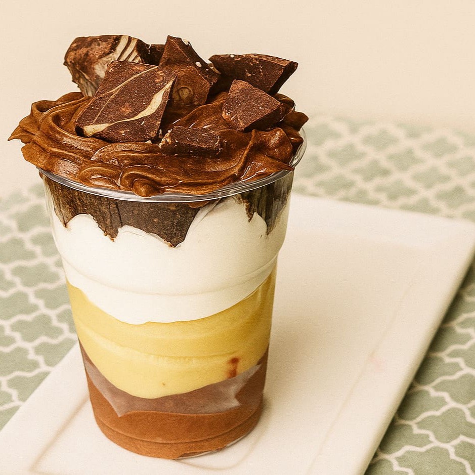 Com camadas de brigadeiro de chocolate 50% com brownie e brigadeiro branco cremoso. Aprox 220ml