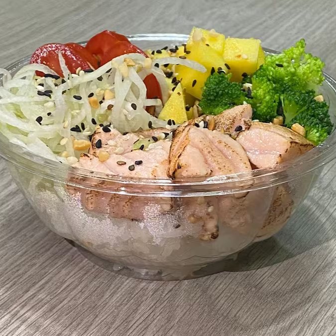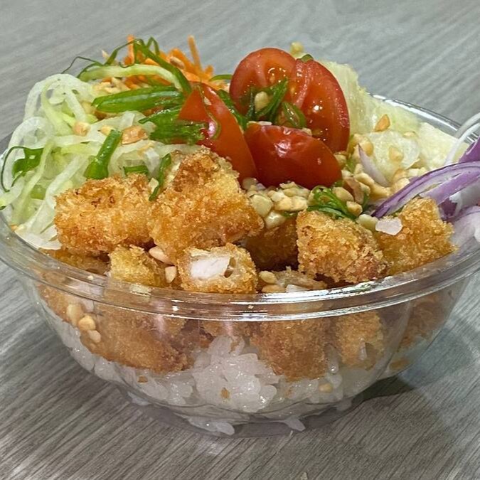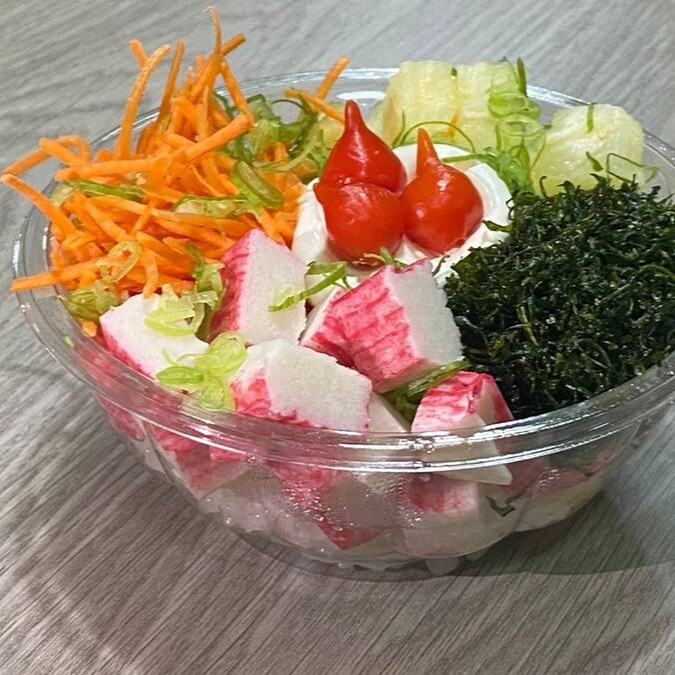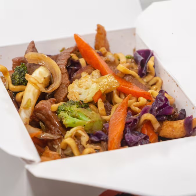 Brócolis, couve flor, repolho roxo, cenoura, repolho verde, macarrão instantâneo e proteína. Preparado com: Saquê Licoroso, Tonkatsu e Shoyu.