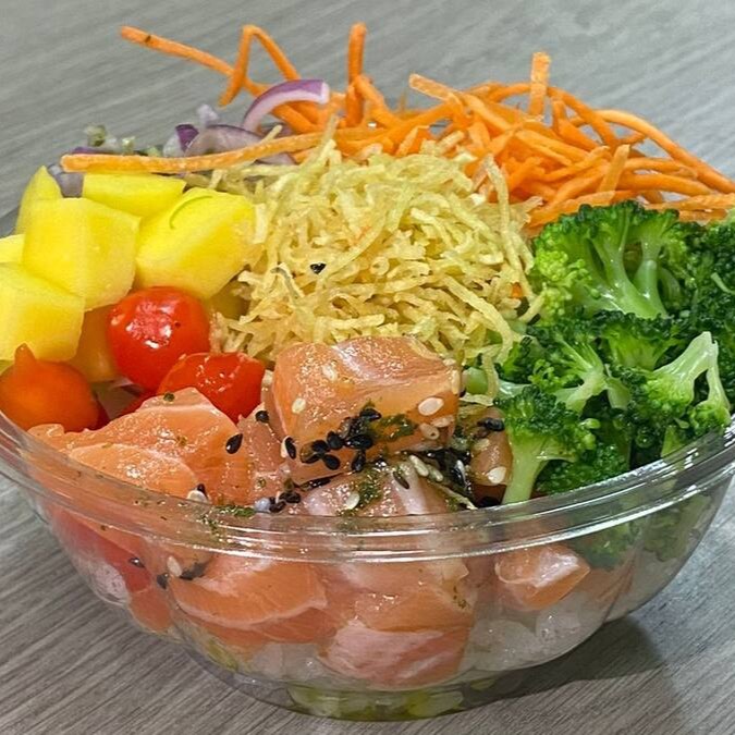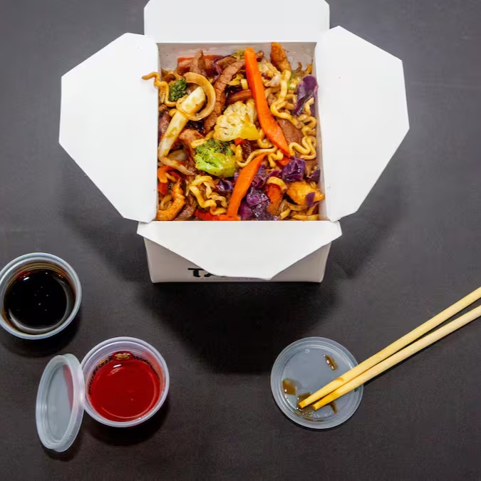 Brócolis, couve flor, repolho roxo, cenoura, repolho verde, couve, macarrão instantâneo e proteína.