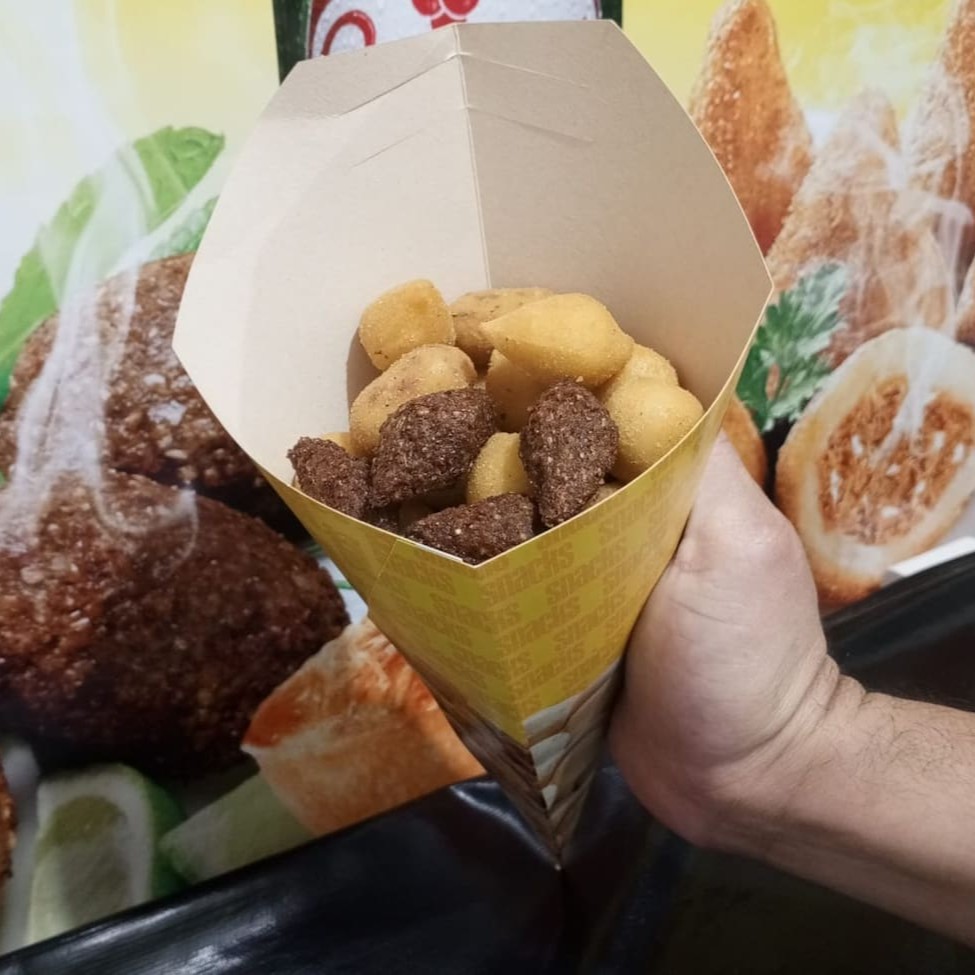 Venha experimentar nosso incrível cone recheado com 15 petiscos deliciosos de aproximadamente 12g! Perfeito para qualquer ocasião, nesse cone você pode escolher uma opção: coxitas crocantes, kibitos suculentos, bolitas de queijo irresistíveis e muito mais!