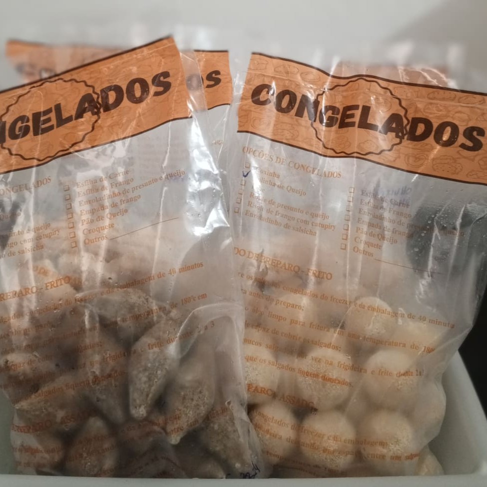 Caixa com salgados de 20g fritos, crocantes e deliciosos.