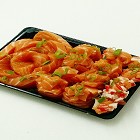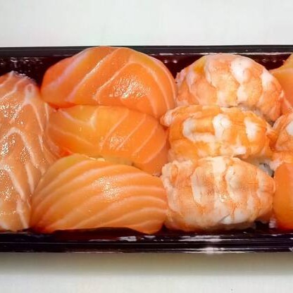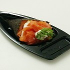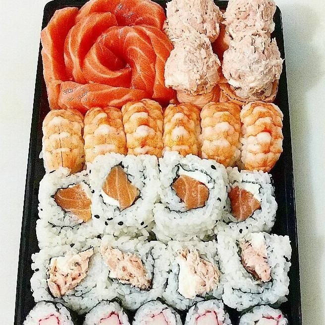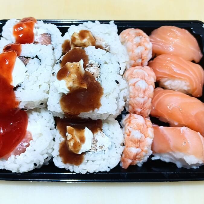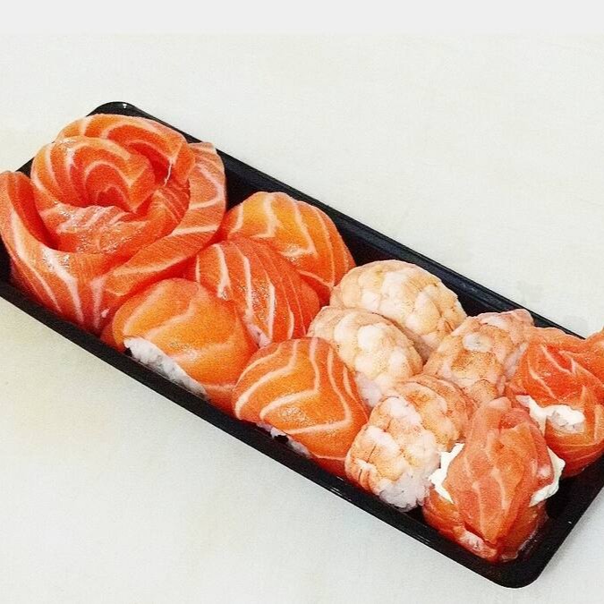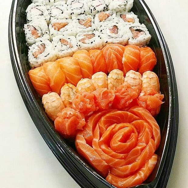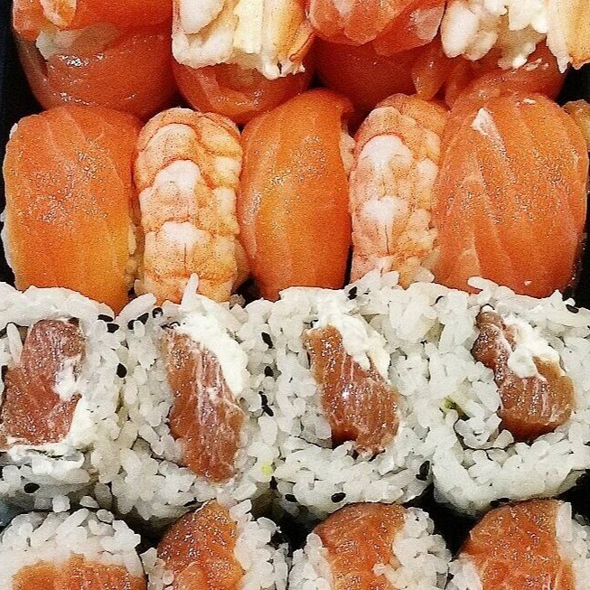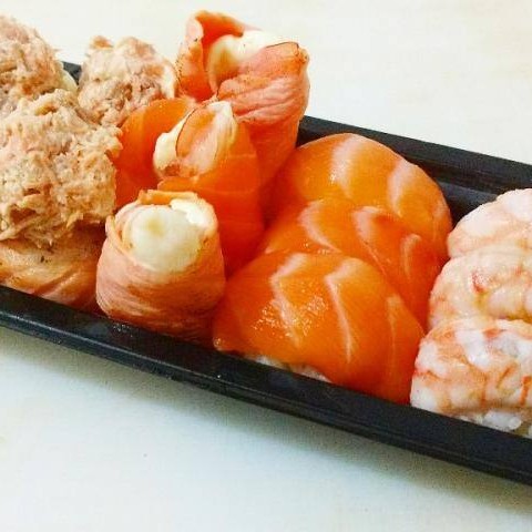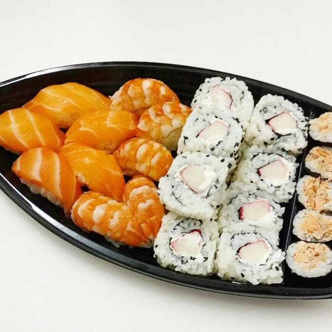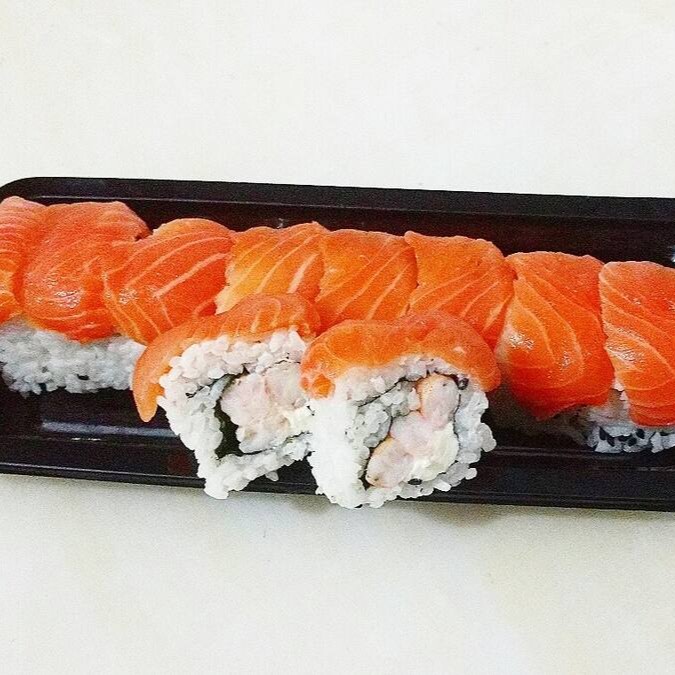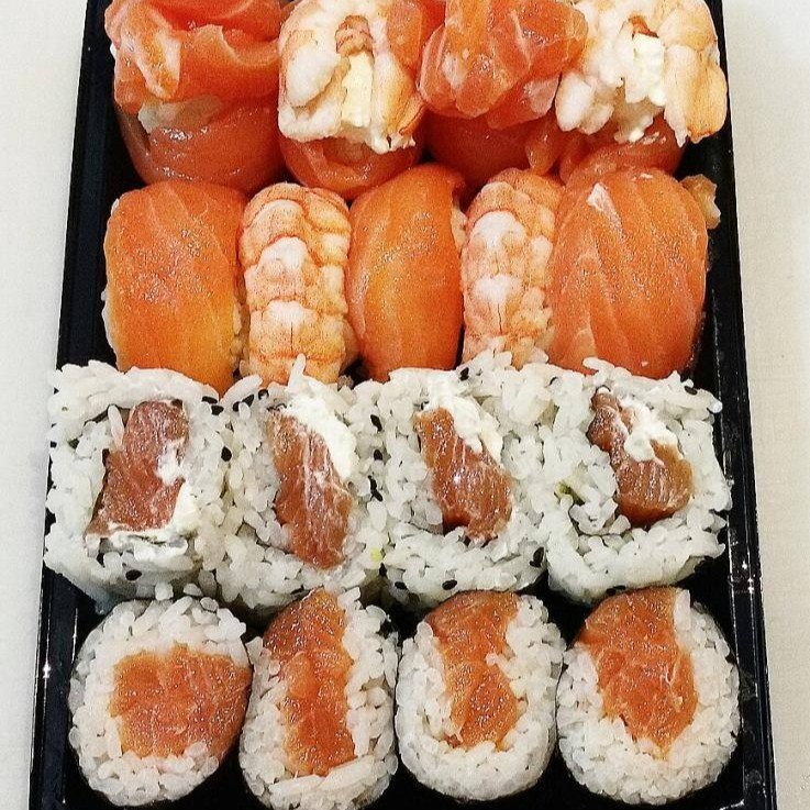 Inclui 10 lâminas de sashimi de salmão, 4 joes de salmão, 6 niguiris de camarão, 6 uraramakis com recheio de salmão com creme cheese e 4 hossomakis com recheio de salmão.
