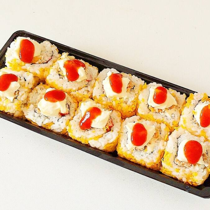 Combinado Mexicano São 8 unidades de uramakis com recheio de salmão, creme cheese, Doritos e pimenta sriracha
