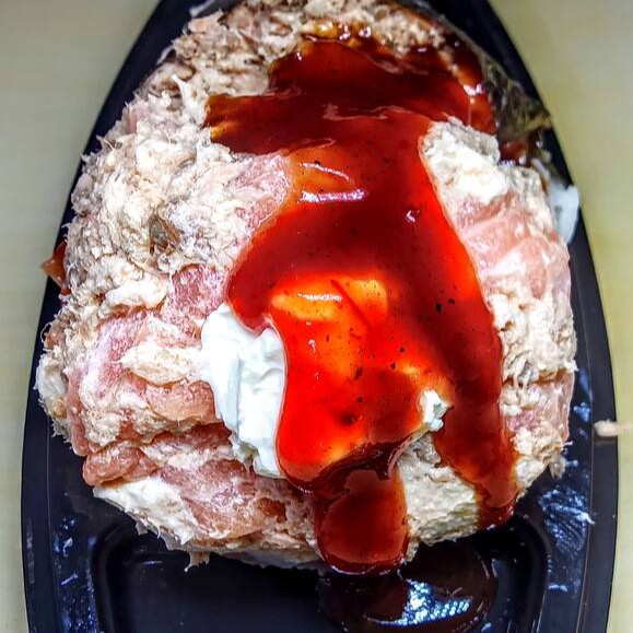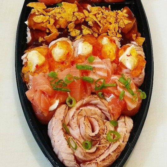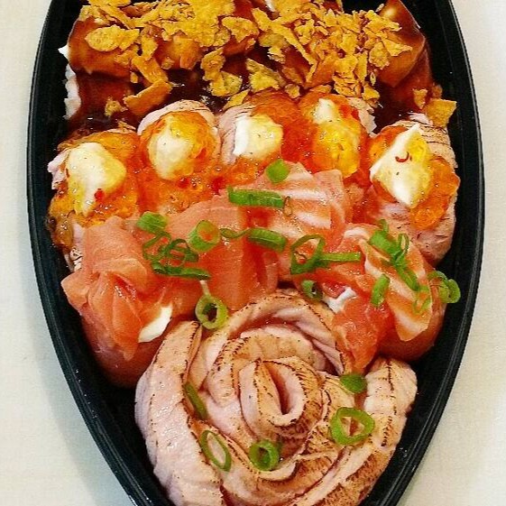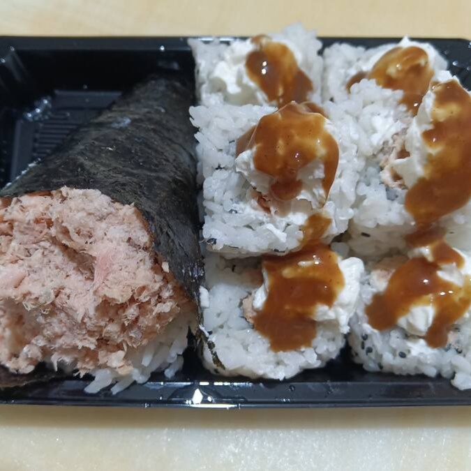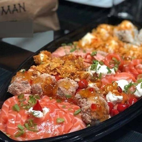 É uma manta de salmão recheada com arroz, creme cheese, salmão, camarão e kani.