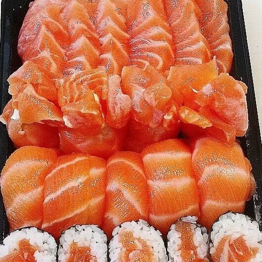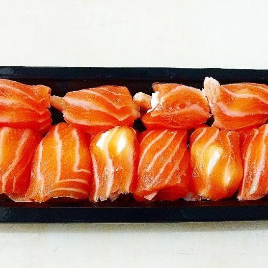 São 11 unidades sashimis de salmão, 8 joes de salmão, recheados com creme cheese e 4 hossomakis de salmão.