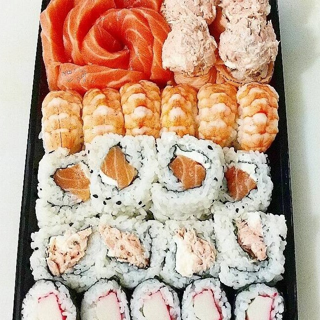 São 15 lâminas de sashimis de salmão, 5 joe de salmão, 7 niguiris de camarão e 7 niguiris de salmão, 10 uramakis com recheio de salmão com creme cheese e 10 uramakis com recheio de kani com cream cheese.