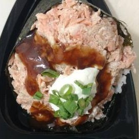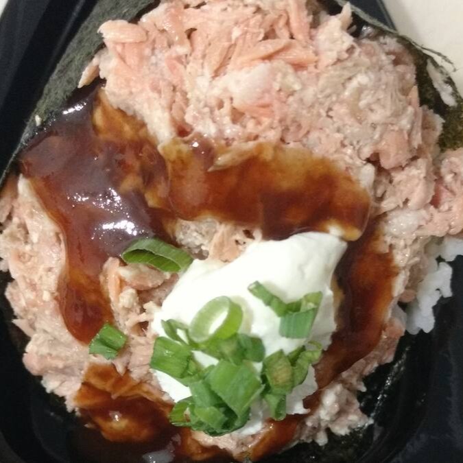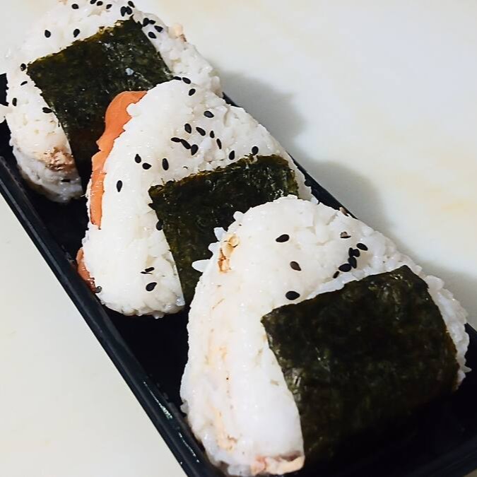 São três unidades de bolinhos de arroz japonês em formato triangular com recheio de salmão e creme cheese.