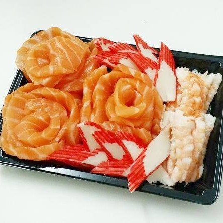 São 15 unidades de sashimis de salmão, 7 sashimis de camarão e 3 sashimis de kani.