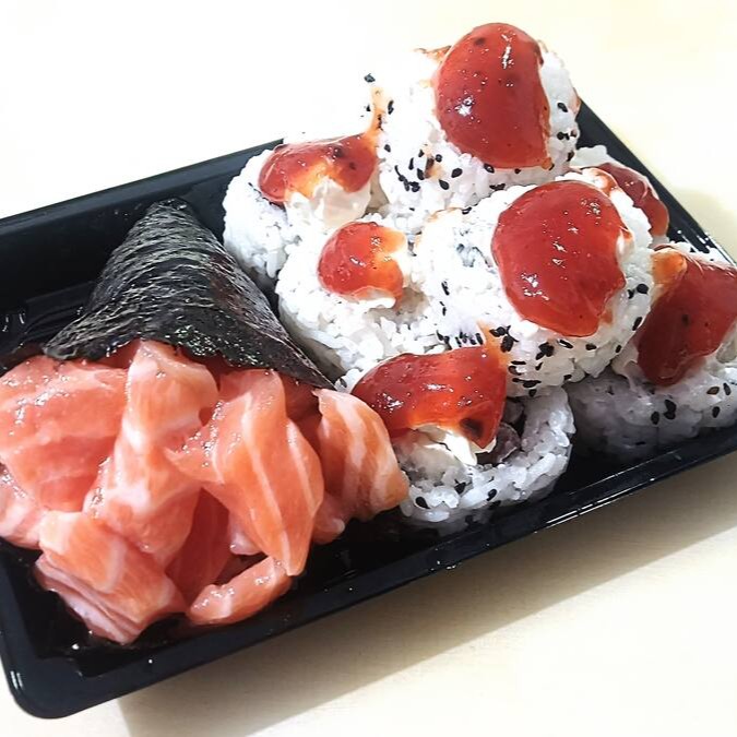 O combinado inclui 4 joes de salmão, 3 niguiris de salmão, 2 niguiris de camarão, 3 uramakis com recheio de salmão e creme cheese e 3 hossomakis com recheio de salmão.