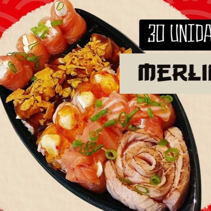 Combinado Merlim 30 unidades. São 12 unidades de sashimis de salmão, 4 joe de salmão, 5 niguiris de salmão, 5 niguiris de camarão e 4 dragin ball Misto, com Doritos, geleia de rubras e molho barbecue + 1 coca cola em lata. Caso queira o combinado todo cru ou todo macaricados e grelhado ou tirar o Doritos por exemplo é só falar no chat