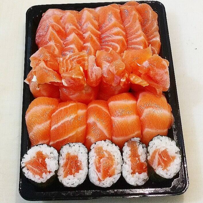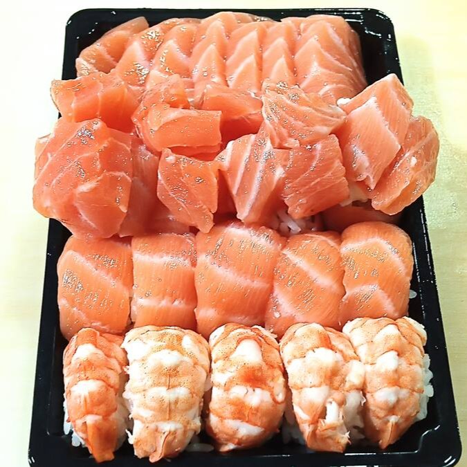 16 lâminas de sashimi de salmão fresco, 5 peças de joe de salmão, 7 niguiris de camarão, 7 niguiris de salmão, 10 uramakis recheados com salmão e 9 uramakis com recheio de kani.