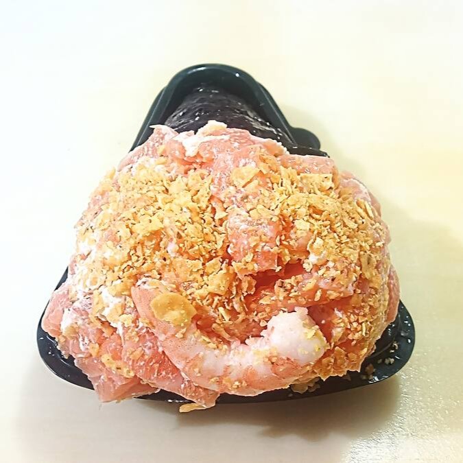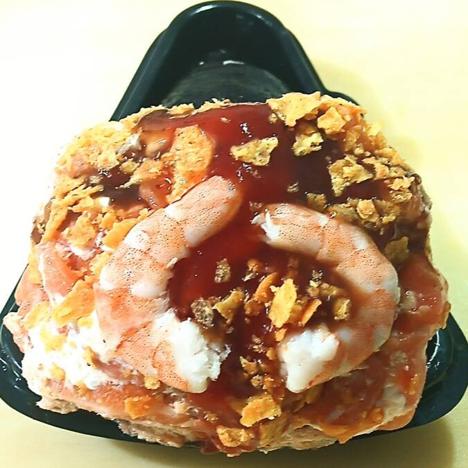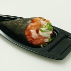 Big temaki de salmão cru ou salmão grelhado, com camarão, creme cheese, arroz e com o recheio misturado com Doritos