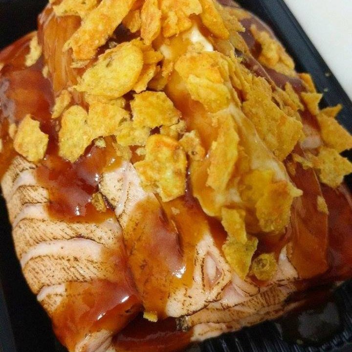 Big temaki de salmão cru com salmão grelhado, camarão, creme cheese, Doritos, arroz, geleia de rubras e molho do chefe