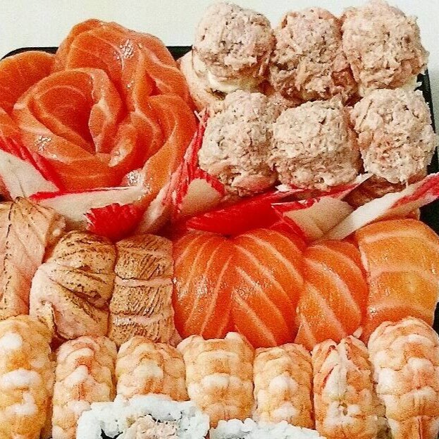 São 13 lâminas de sashimis de salmão, 5 joe de salmão, 7 niguiris de camarão e 7 niguiris de salmão, 10 uramakis com recheio de salmão com creme cheese, 8 uramakis com recheio de kani com cream cheese e 4 Dragon Balls, lâminas de salmão com recheio de creme cheese e camarão