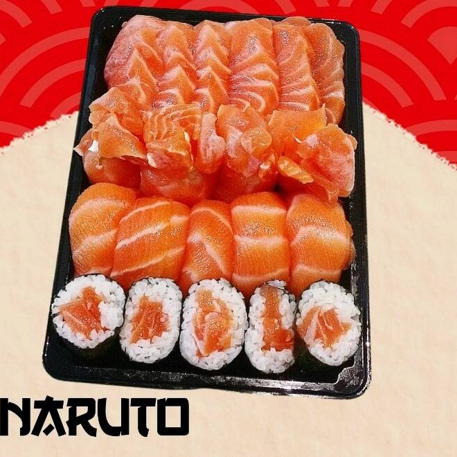 Combinado Naruto 20 unidades São 6 unidades de sashimis de salmão, 4 joe de salmão, 5 niguiris de salmão e 4 hossomaki de salmão. Todo cru, com Doritos, geleia de rubras e molho barbecue + 1 coca cola em lata. Caso queira o combinado misto ou todo macaricados e grelhado ou tirar o Doritos por exemplo é só falar no chat