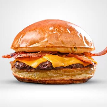 Blend Smash 120g , duas fatias de queijo , bacon, maionese temperada no pão selado na chapa.