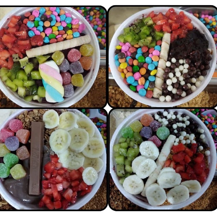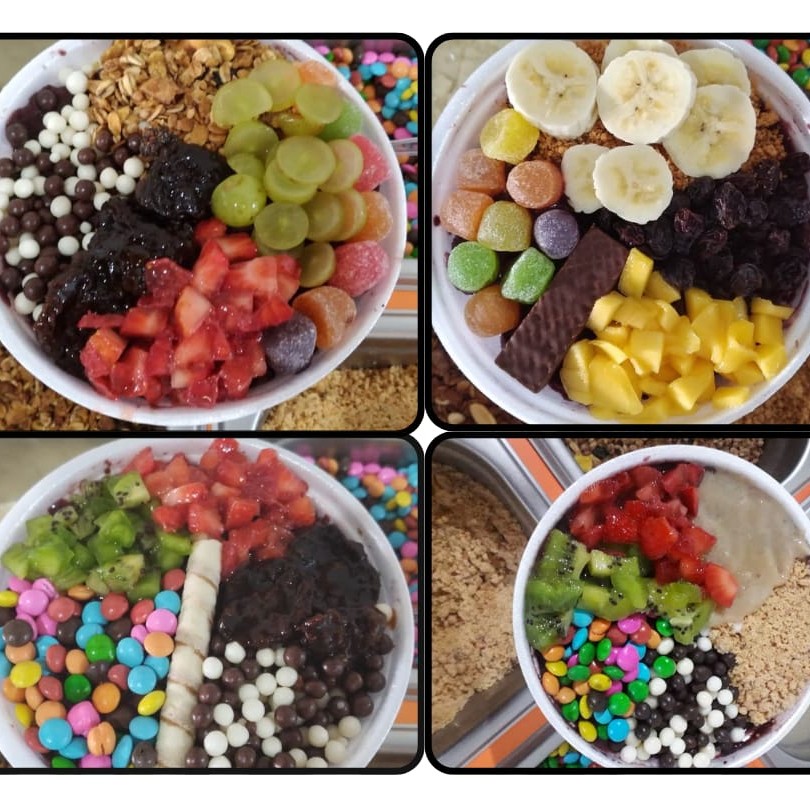 Adicione: 1 creme ou Sorvete + 3 acompanhamentos + 2 frutas + 2 coberturas