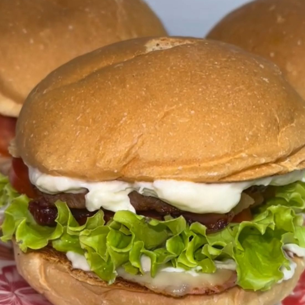 hamburguer tradicional: pão, queijo, carne, tomate, alface.