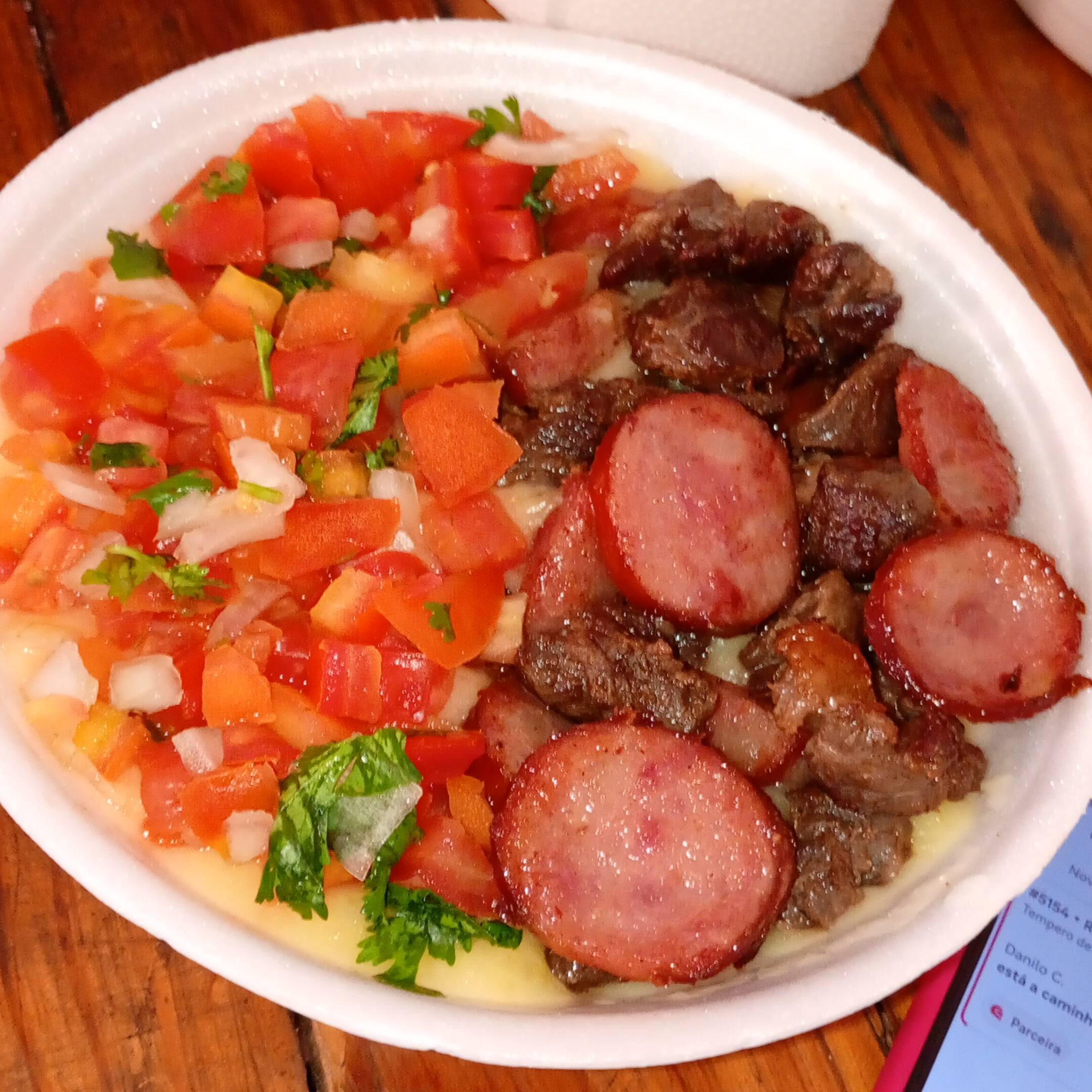 Pirão de aipim ,Carne frango calabresa e salada vinagrete Marmitex Pequena 250g