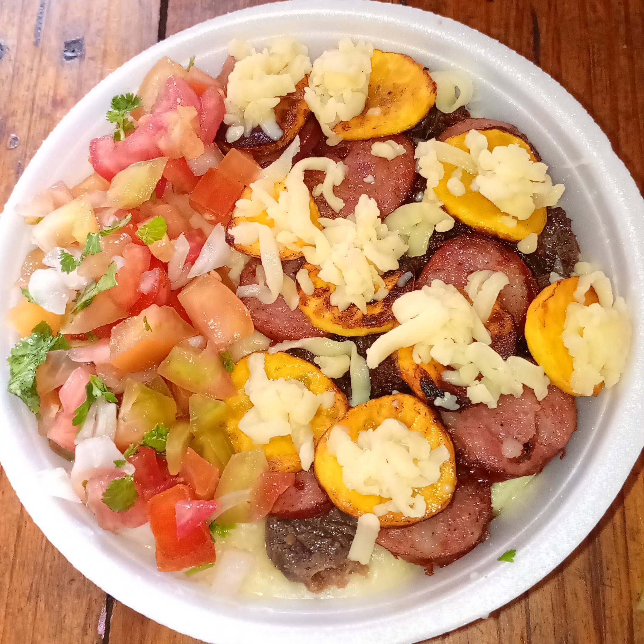 Pirão de aipim, carne do sol calabresa banana da terra queijo mussarela e salada vinagrete 500g