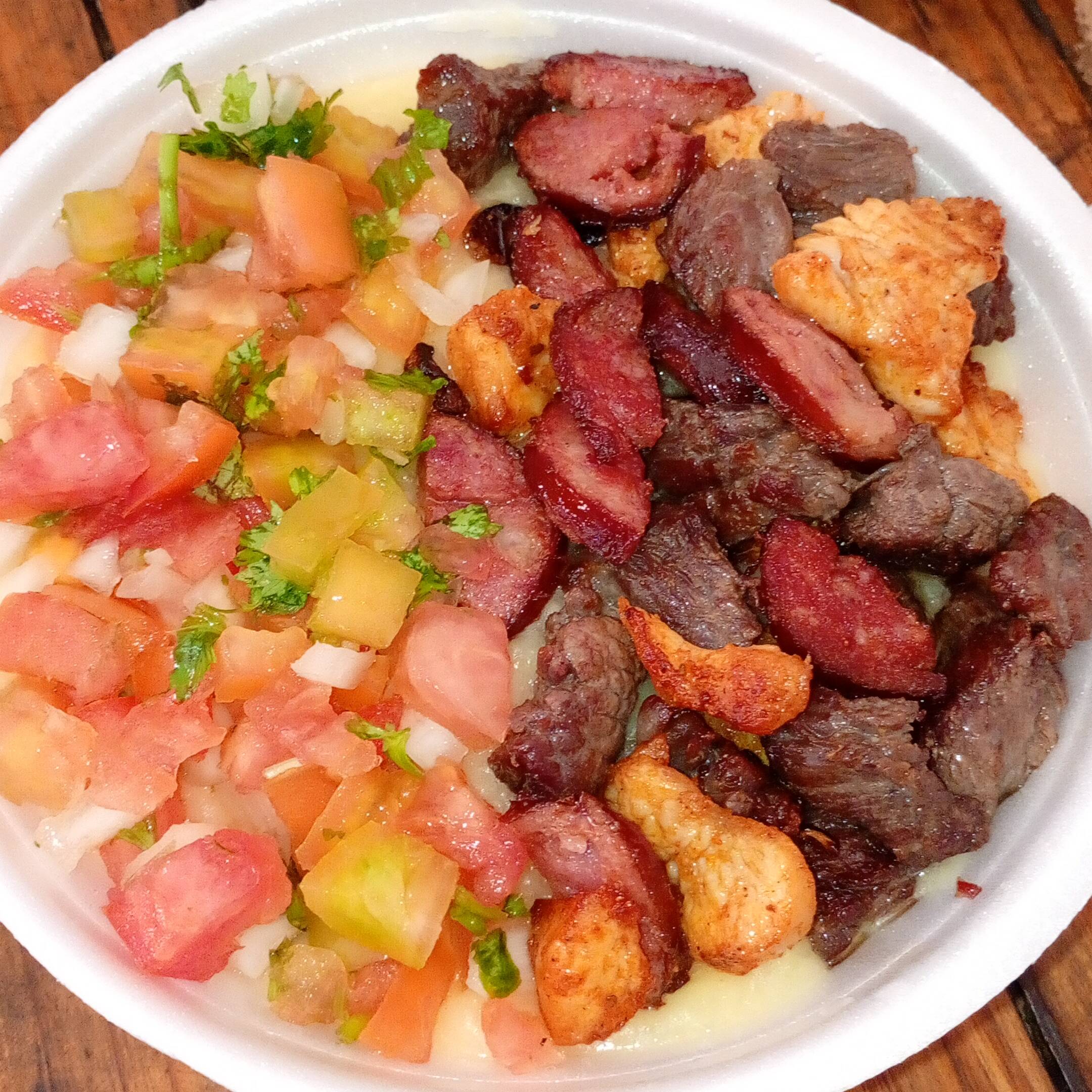 Pirão de aipim , carne do sol calabresa Frango e salada vinagrete 500g