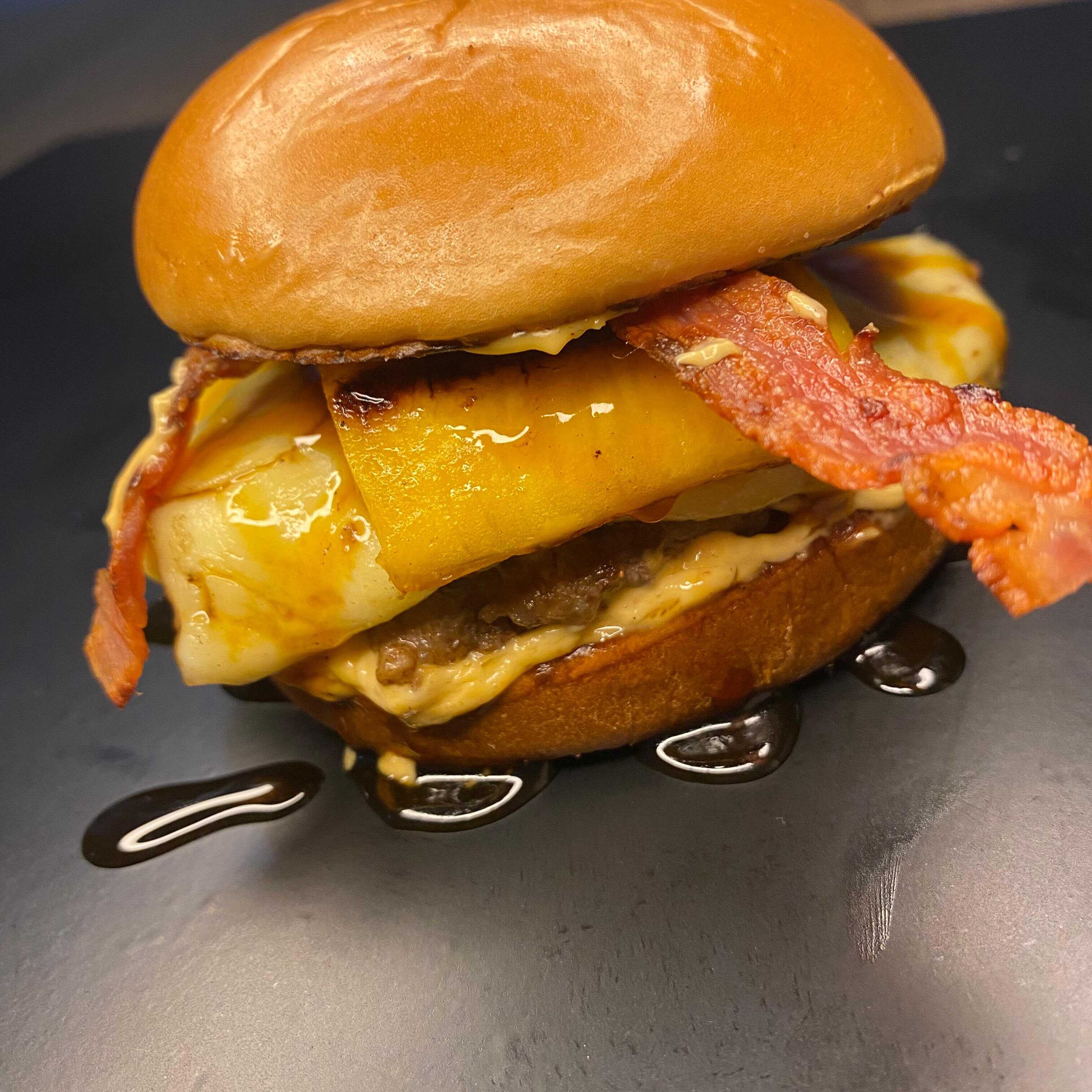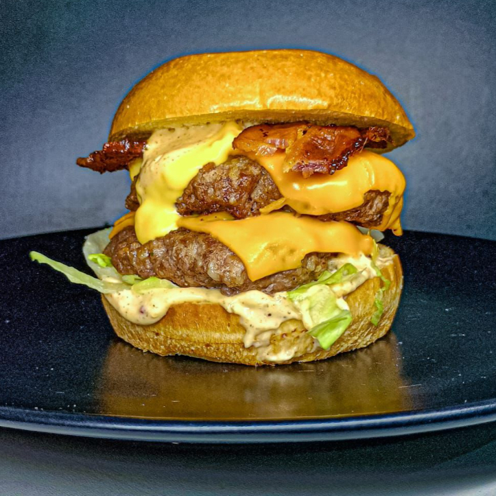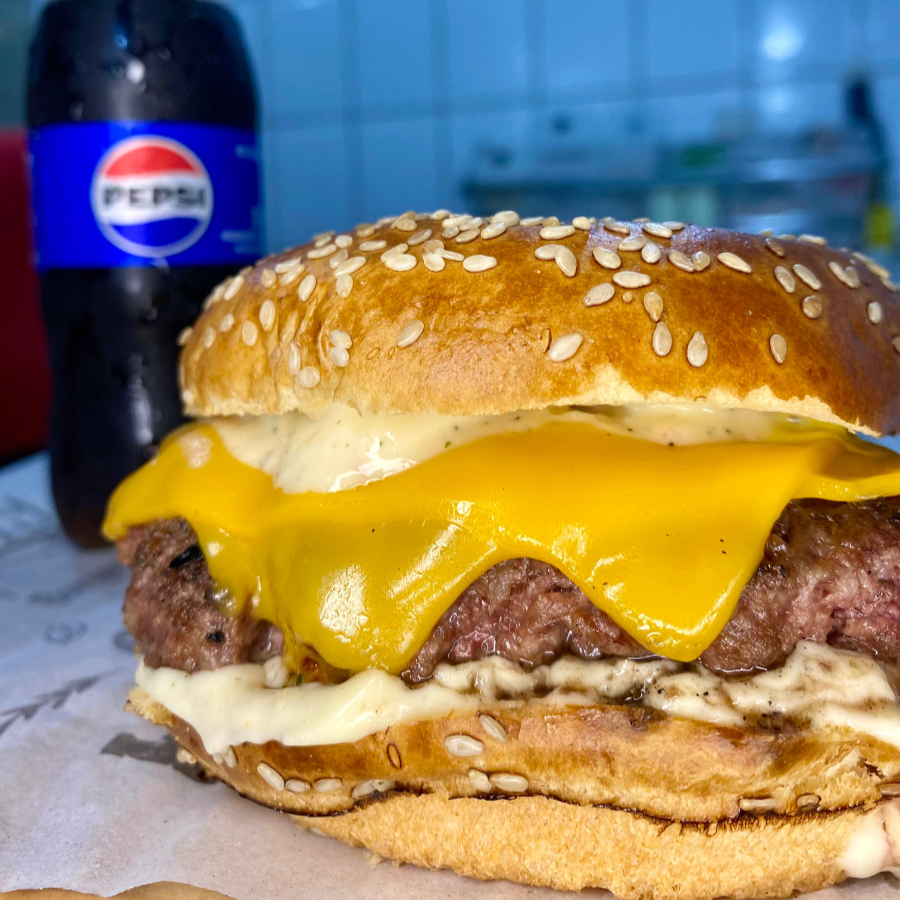 Uma explosão dupla de sabor. Pão artesanal macio, maionese da casa, cebola caramelizada, 2 carnes suculentas (120g), fatia de cheddar e molho cheddar entre as carnes, bacon em tiras crocantes, salada fresquinha. • Diagnóstico: trata sua fome extrema com dupla suculência de sabor.