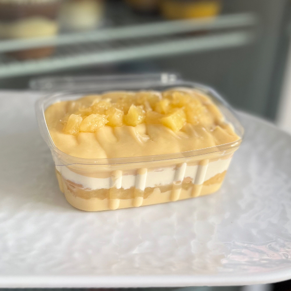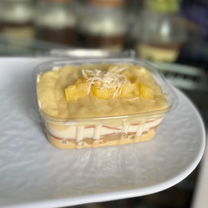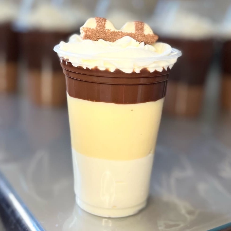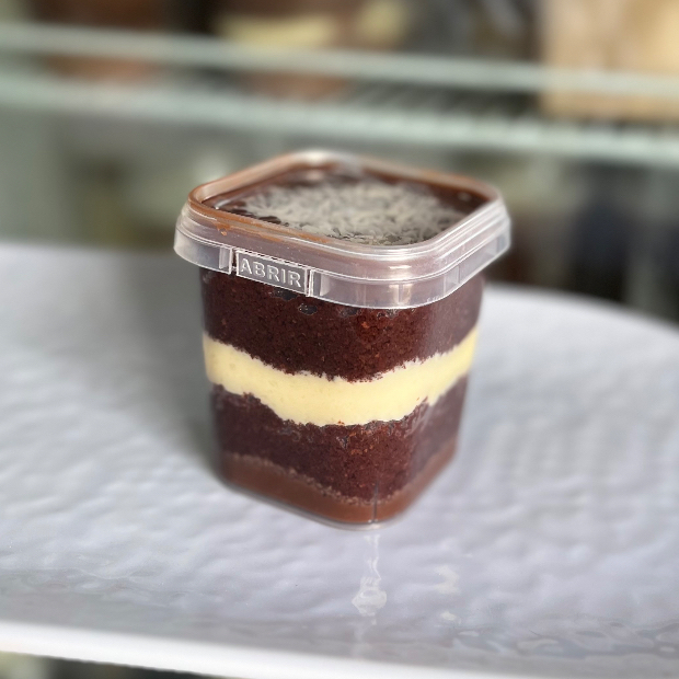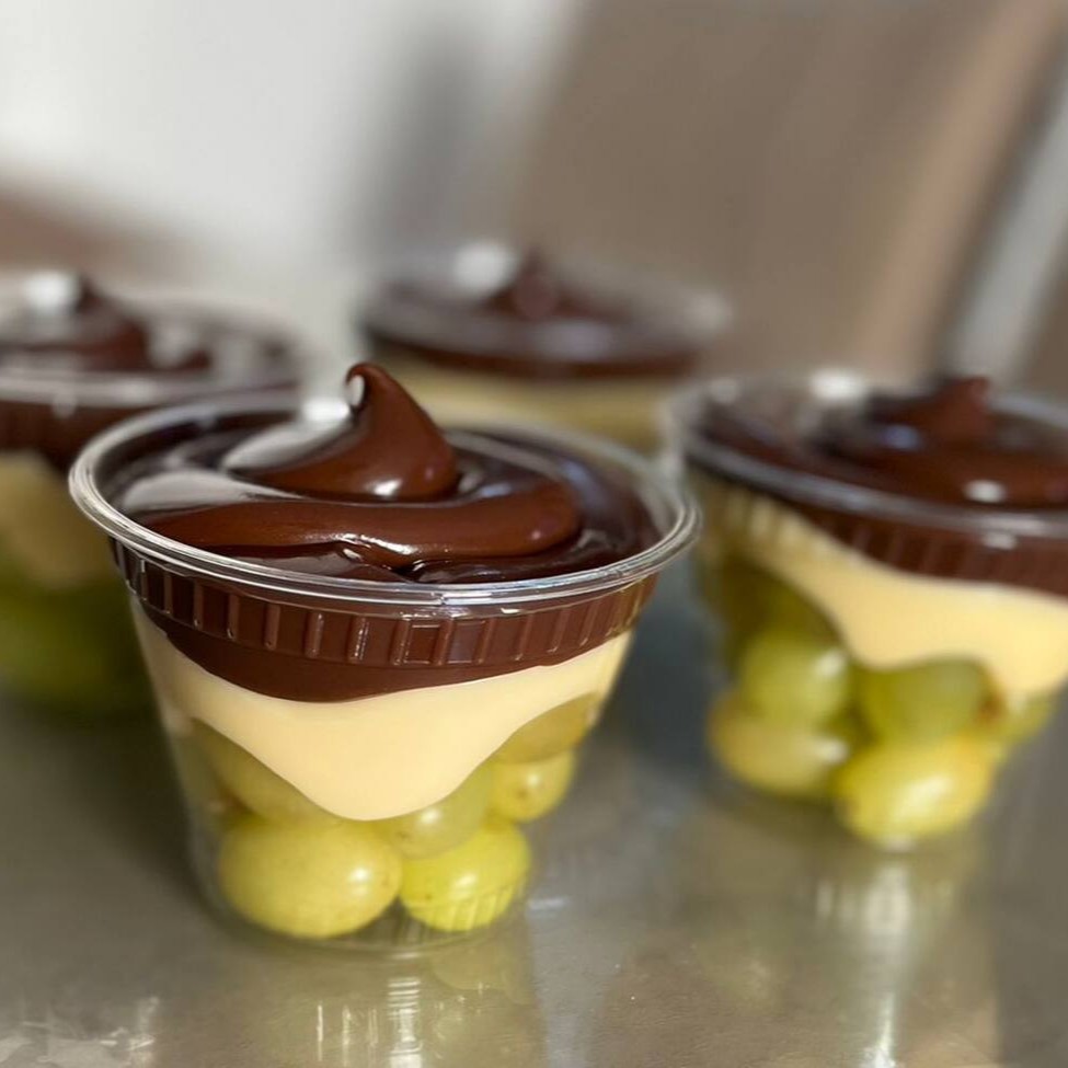 Brigadeiro Ninho, mousse Ninho, geleia de abacaxi e biscoito maisena.