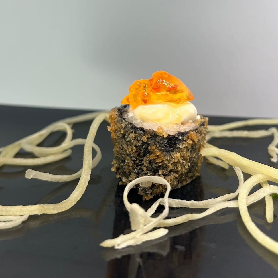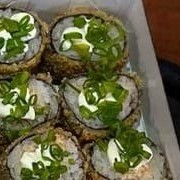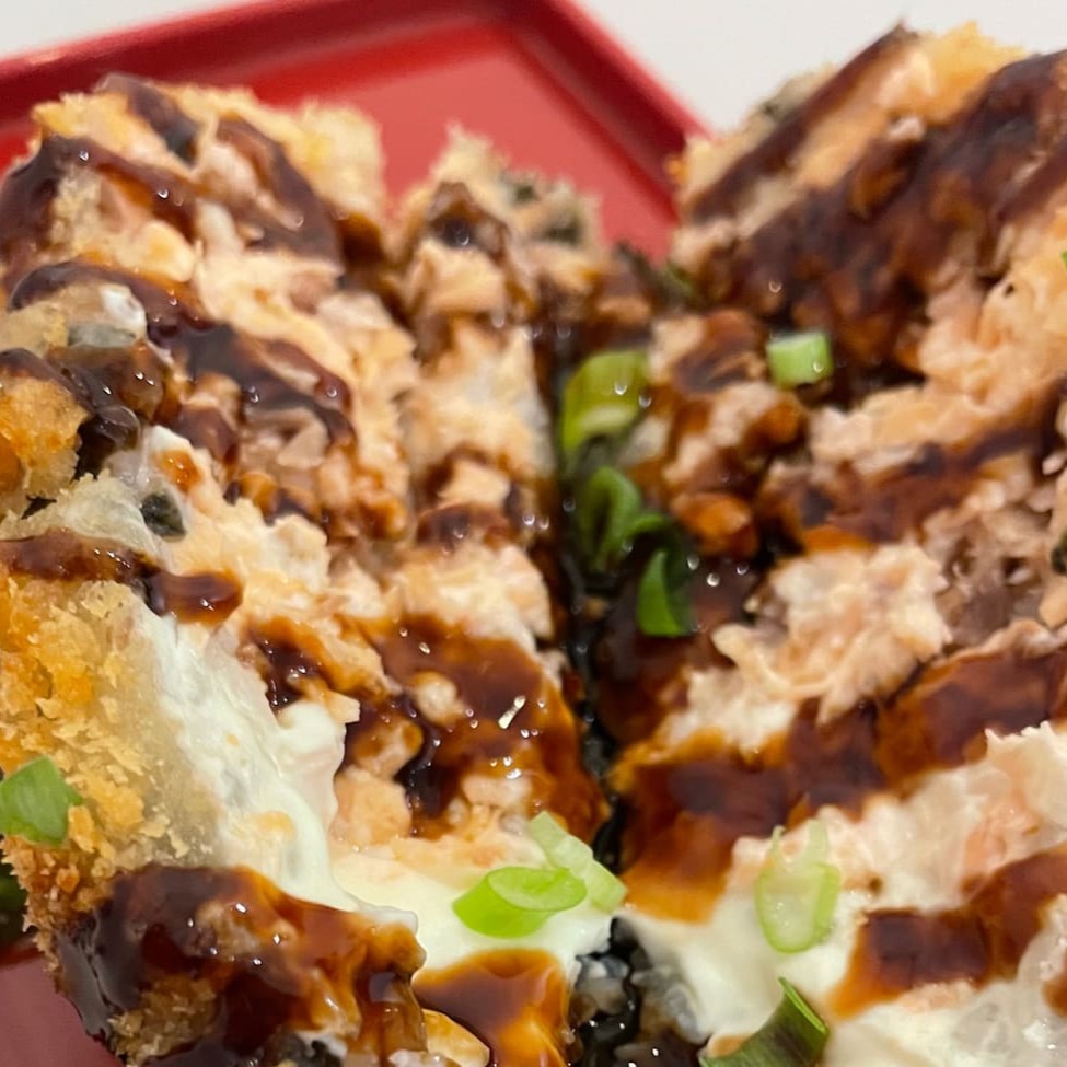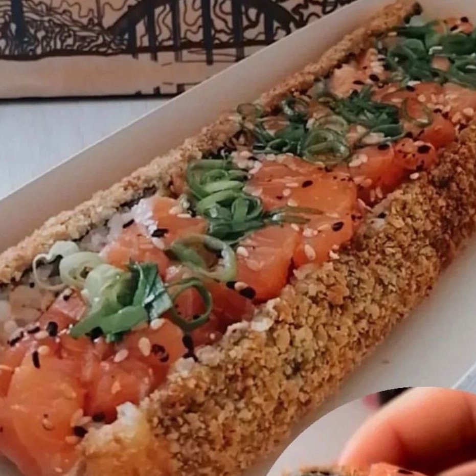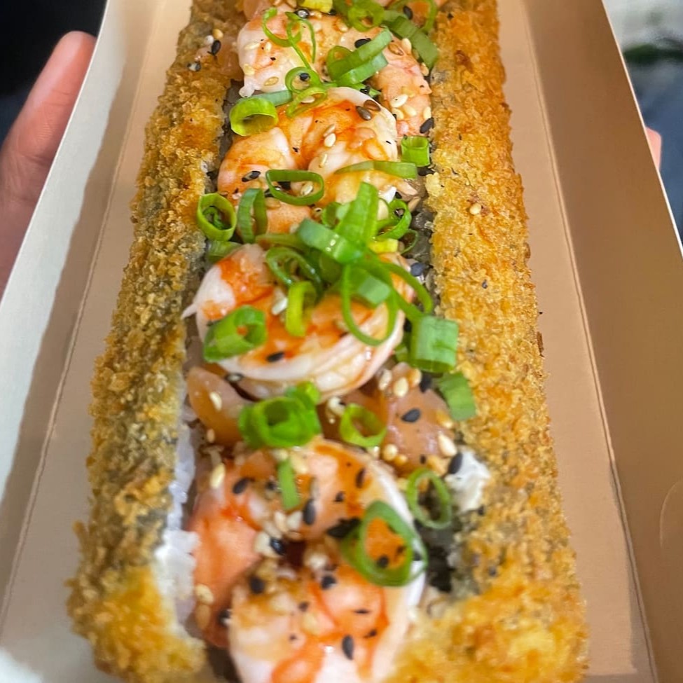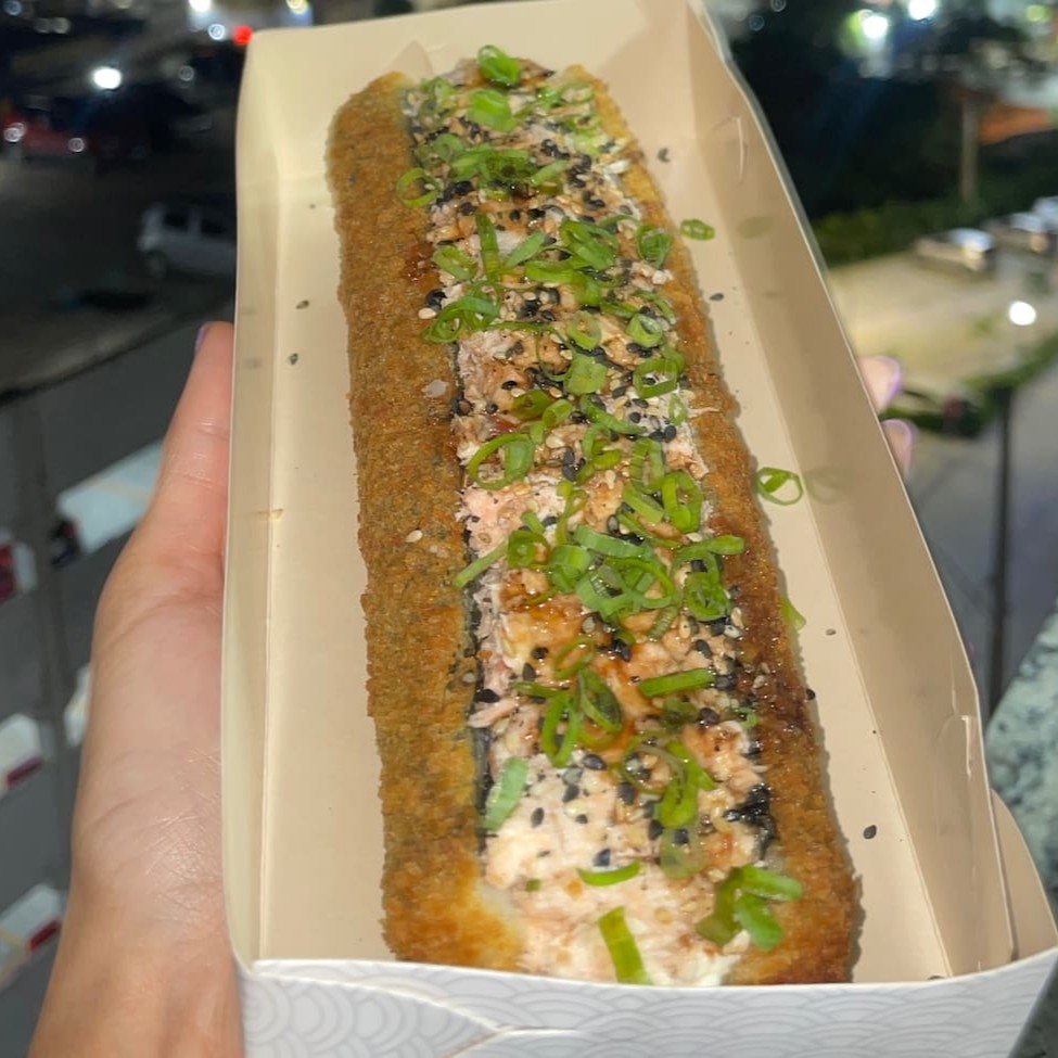Rolo de alga nori, com arroz japonês e cream cheese, empanado com farinha panko e então frito. Com recheio de salmão cru e camarão com mais cream cheese, cebolinha e gergelim. Aproximadamente 19cm. Não acompanha molho nem hashi.