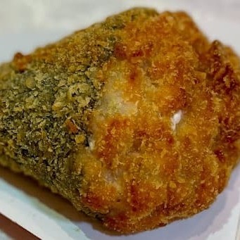 Alga Nori, Arroz japonês, Salmão, Camarão, cream cheese, gergelim e cebolinha. Empanado na farinha panko e frito. Não acompanha molho nem hashi.