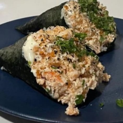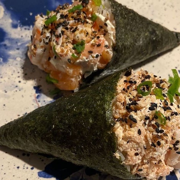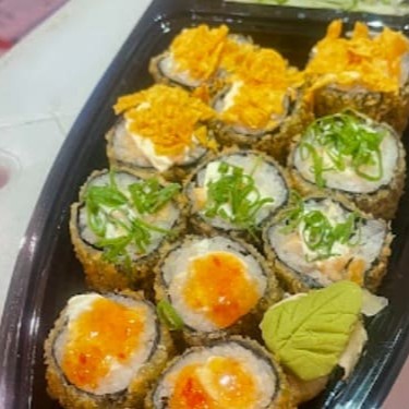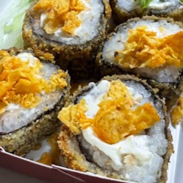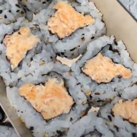 Arroz japonês, nori, salmão grelhado e cream cheese, enrolados e empanados em farinha panko, finalizados com Doritos. Não acompanha molho nem hashi.