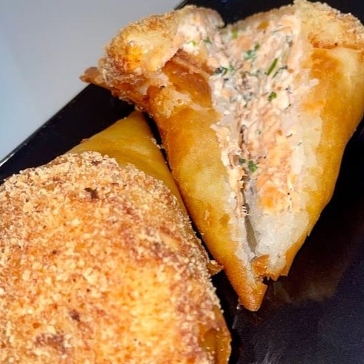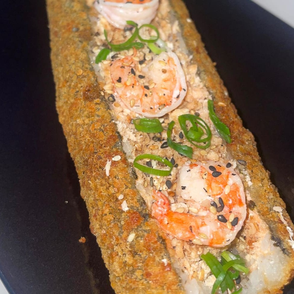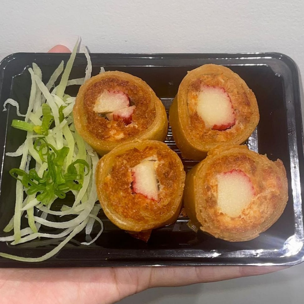 Massa harumaki, Arroz japonês, Salmão, camarão, cream cheese, gergelim e cebolinha. Empanado na farinha panko e frito. Não acompanha molho nem hashi.