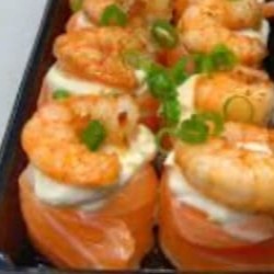 Uma capa de salmão cru maçaricado , com 80g de recheio de salmão cru maçaricado e 40g de camarão, cream cheese, cebolinha e gergelim, finalizado com molho teriaki. Peso total aproximadamente 300g. Não acompanha molho nem hashi.