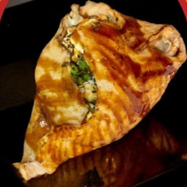 Uma capa de salmão cru maçaricado , com 120g de recheio de salmão cru maçaricado , cream cheese, cebolinha e gergelim, finalizado com molho teriaki. Peso total aproximadamente 300g. Não acompanha molho nem hashi.