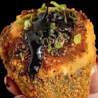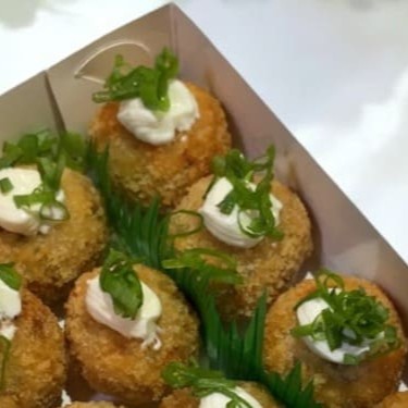 Bolinhas de salmão grelhado, cream cheese, gergelim e cebolinha. Empanado na farinha panko e frito. Não acompanha molho nem hashi.