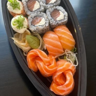 Salmão cru e arroz japonês. Não acompanha molho nem hashi.