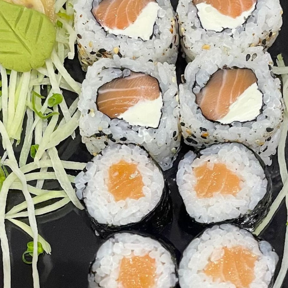 4 Hossomaki de Salmão Cru, 4 Uramaki Philadelphia. Não acompanha molho nem hashi.