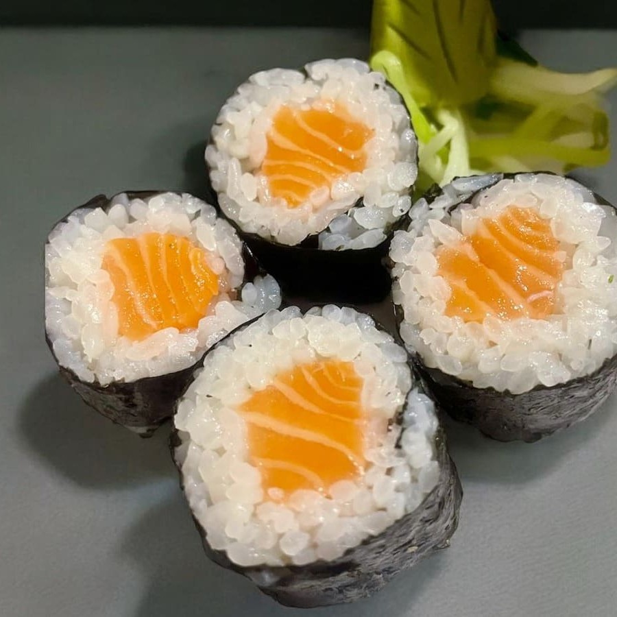 Arroz japonês, alga nori e salmão cru. Não acompanha molho nem hashi.