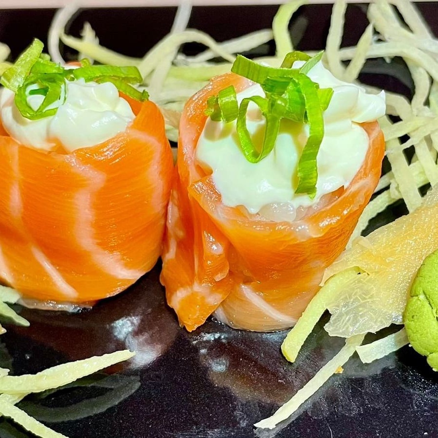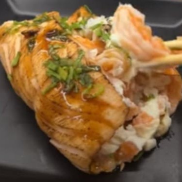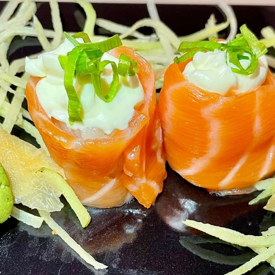 Uma capa de salmão cru maçaricado , com 80g de recheio de salmão cru maçaricado , 40g de arroz, cream cheese, cebolinha e gergelim, finalizado com molho teriaki. Peso total aproximadamente 300g. Não acompanha molho nem hashi.