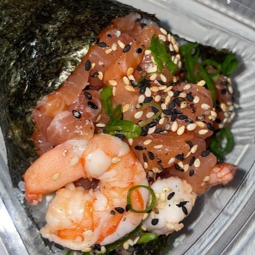 Salmão, camarão, arroz, creme cheese e cebolinha. Não acompanha molho nem hashi.