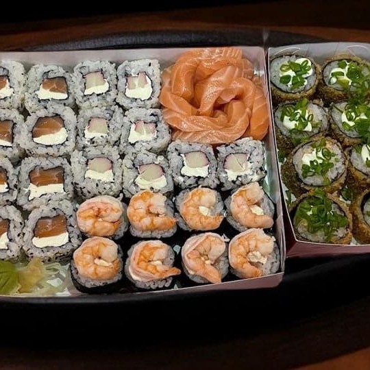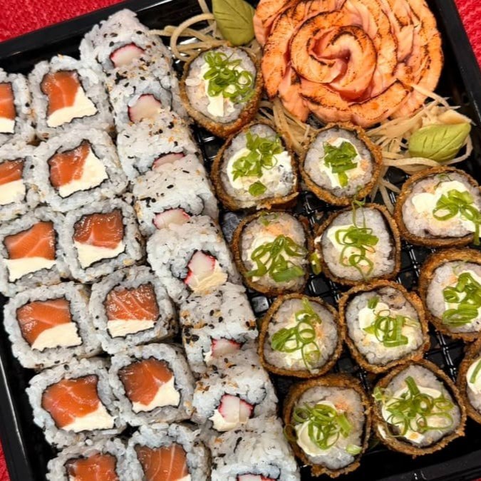 8 Uramaki Philadelphia , 8 Uramaki Kani, 8 Hossomaki de Salmão Cru e Camarão, 8 Hot Holl, 8 Lâminas de Sashimi Cru. Não acompanha molho nem hashi.