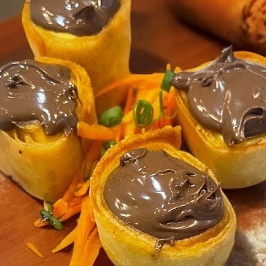 Banana, enrolada na massa harumaki e frito, finalizado com cobertura de Nutella. Não acompanha molho nem hashi.