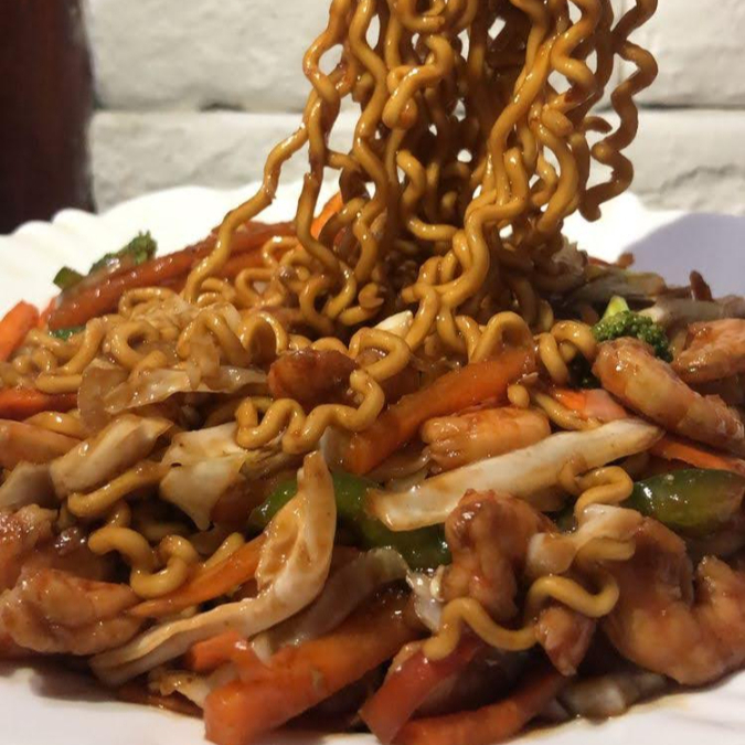 Tradicional yakissoba com camarão, carne , frango , legumes frescos e macarrão ao molho especial .
