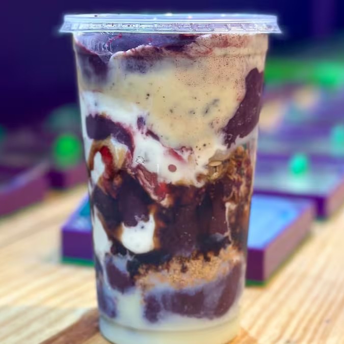 Açai batido com, Leite condensado, Leite pó e Calda de Cookies