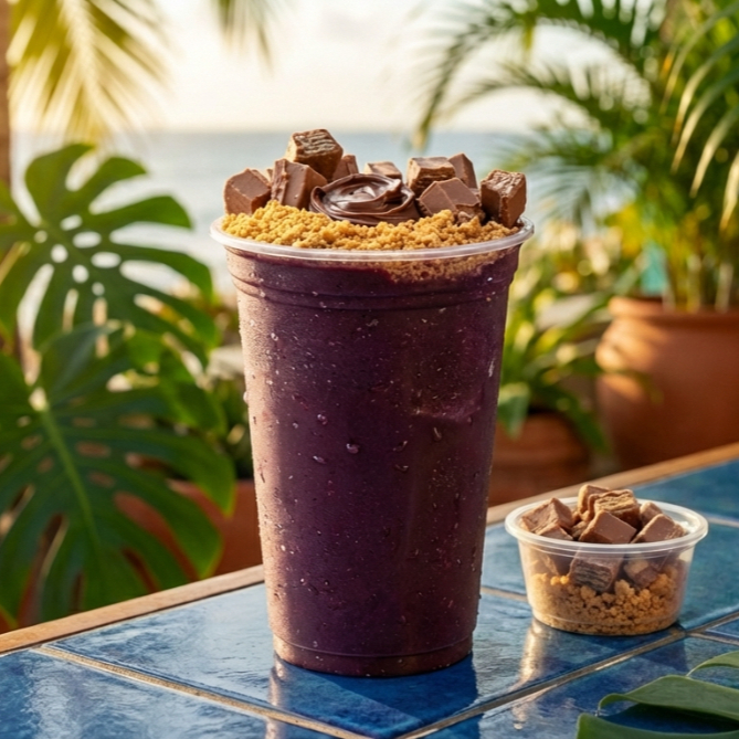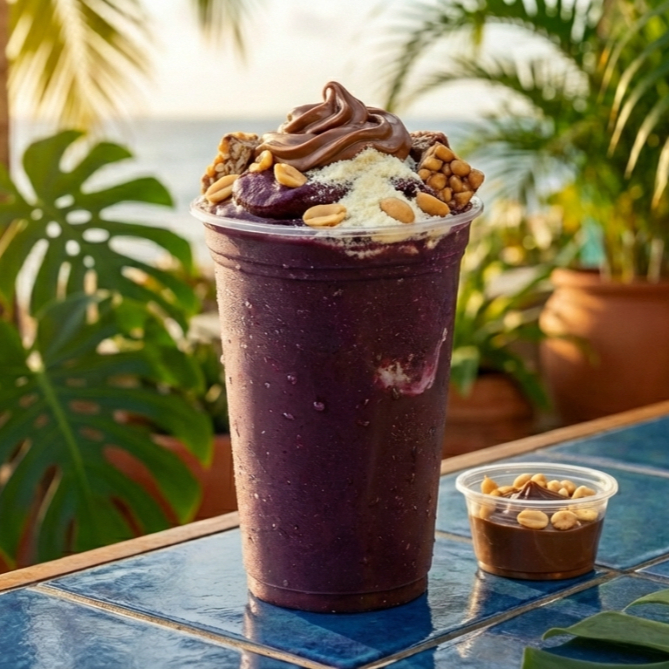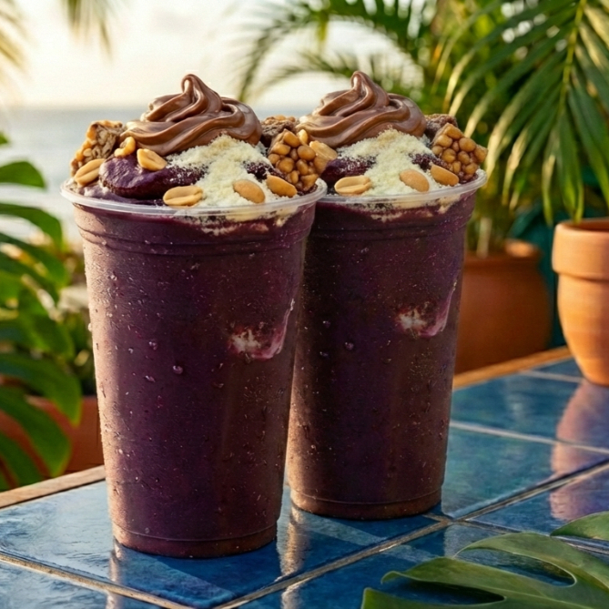 Açaí (500 ml) Creme de avelã, Leitinho, Chocopower, Leite condensado, Paçoca e amendoim.